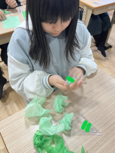 ②袋の中にお花紙を入れて、テープで留める