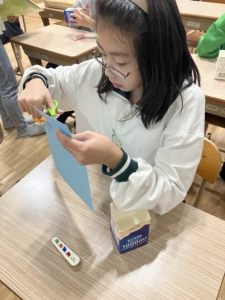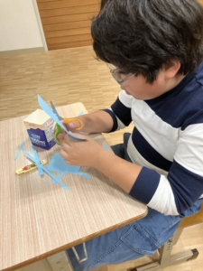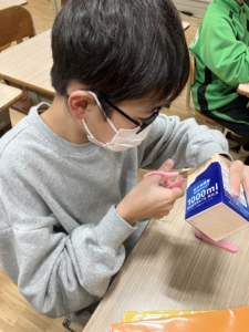 線からずれないように切る、下の牛乳パックが見えないように画用紙をきれいに貼るなど、