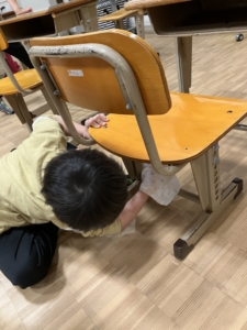 雑巾の絞り方を確認した後、椅子・棚・窓を拭いていきます。