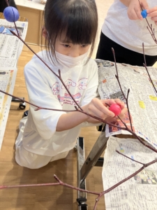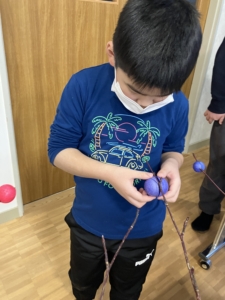 ④まゆ玉を飾り終わったら、12月金曜日の活動で作った縁起物の飾りを枝に吊るして完成!