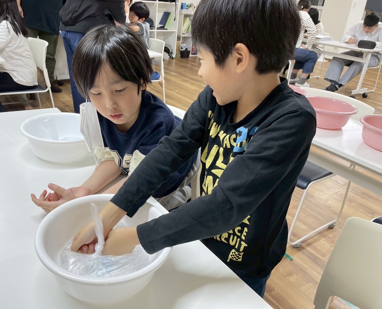 まずは普通の水を触ってもらい、その後は、袋と水を使ったアイテムを使いました!