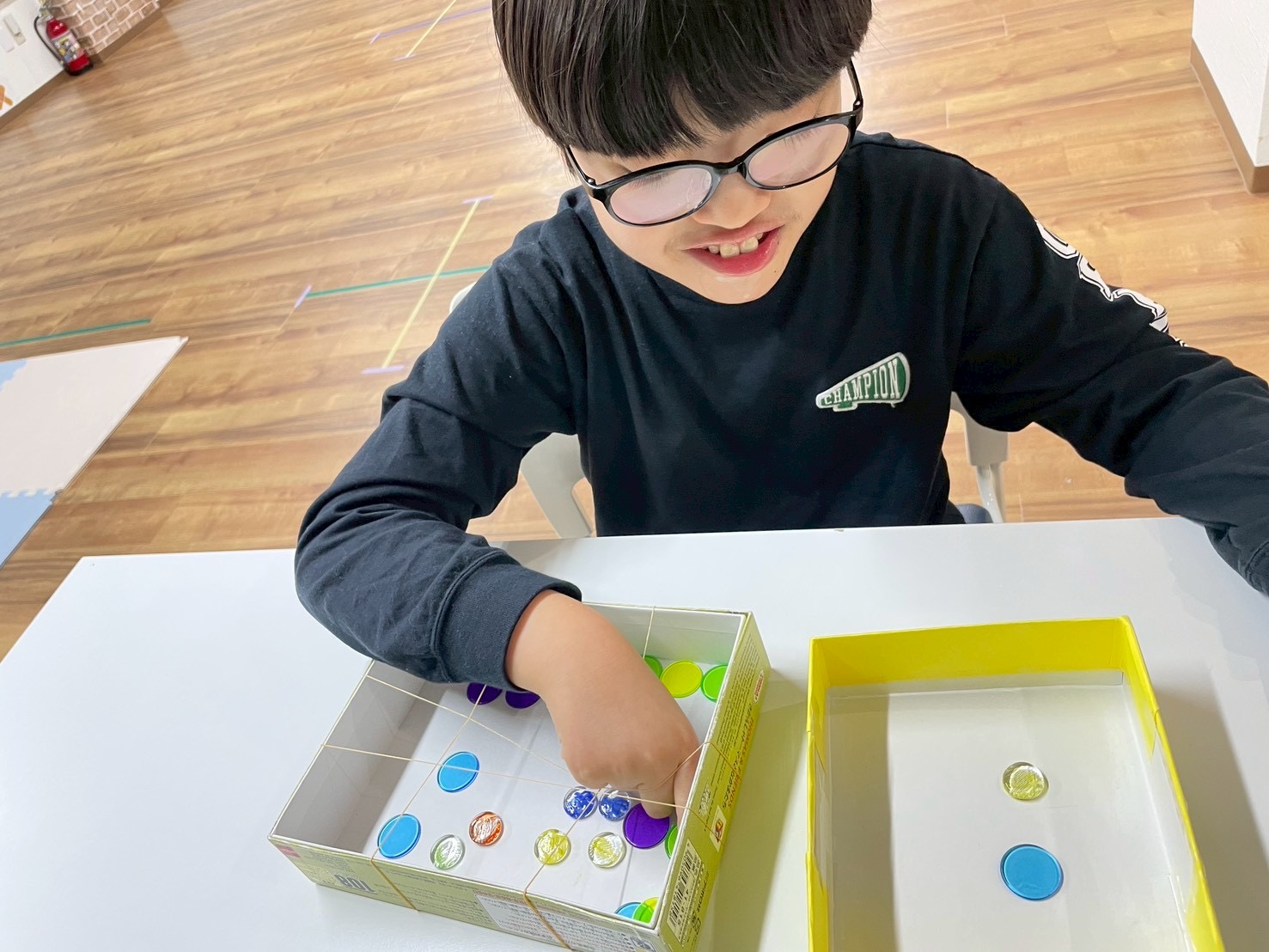 指先練習は、輪ゴムをよけておはじきを取ったり、マッチングはカードの選択などを行っています!