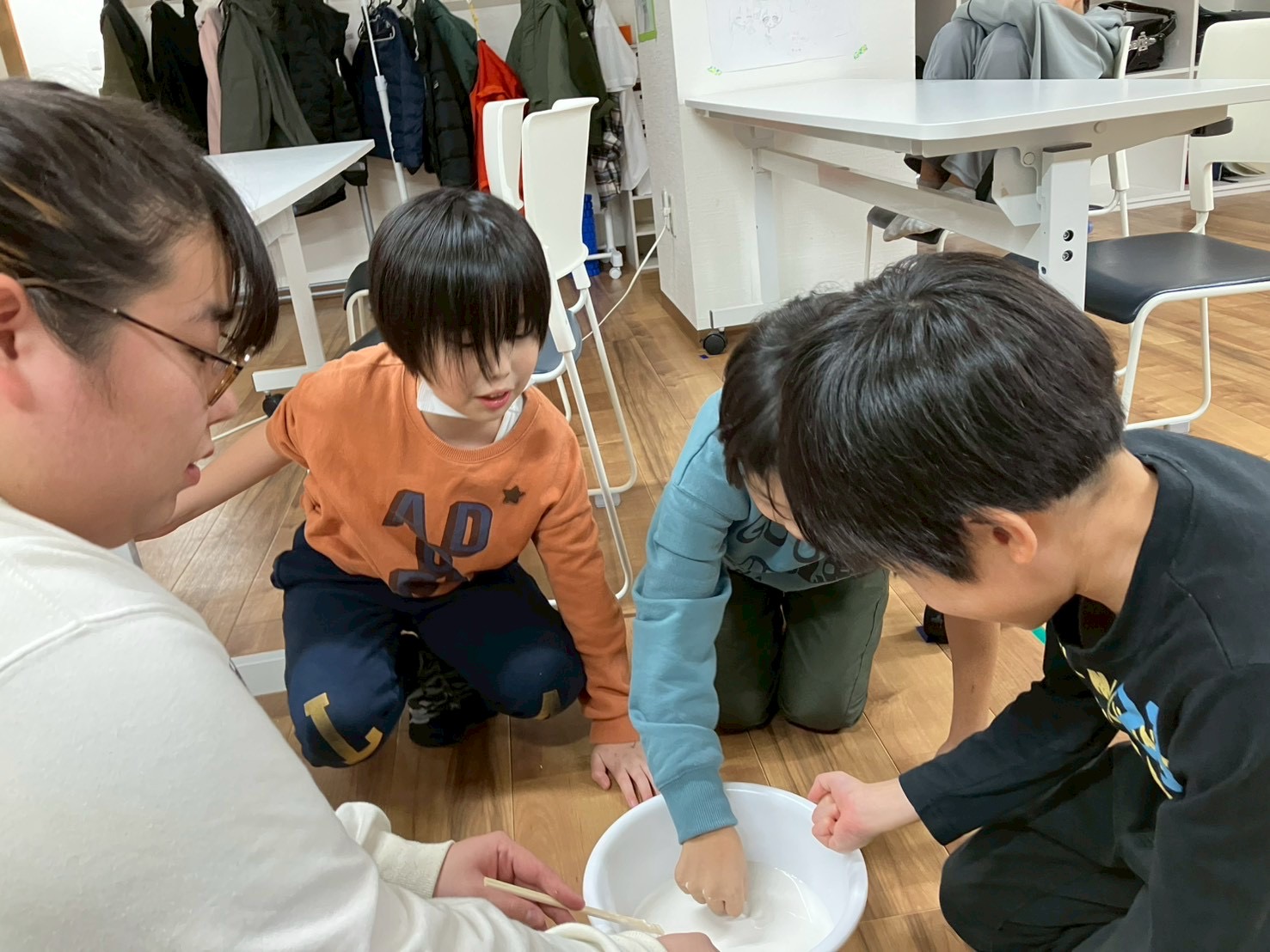 最初に、水溶き片栗粉を混ぜてどのような感触なのか?実際に触ってみました✨
