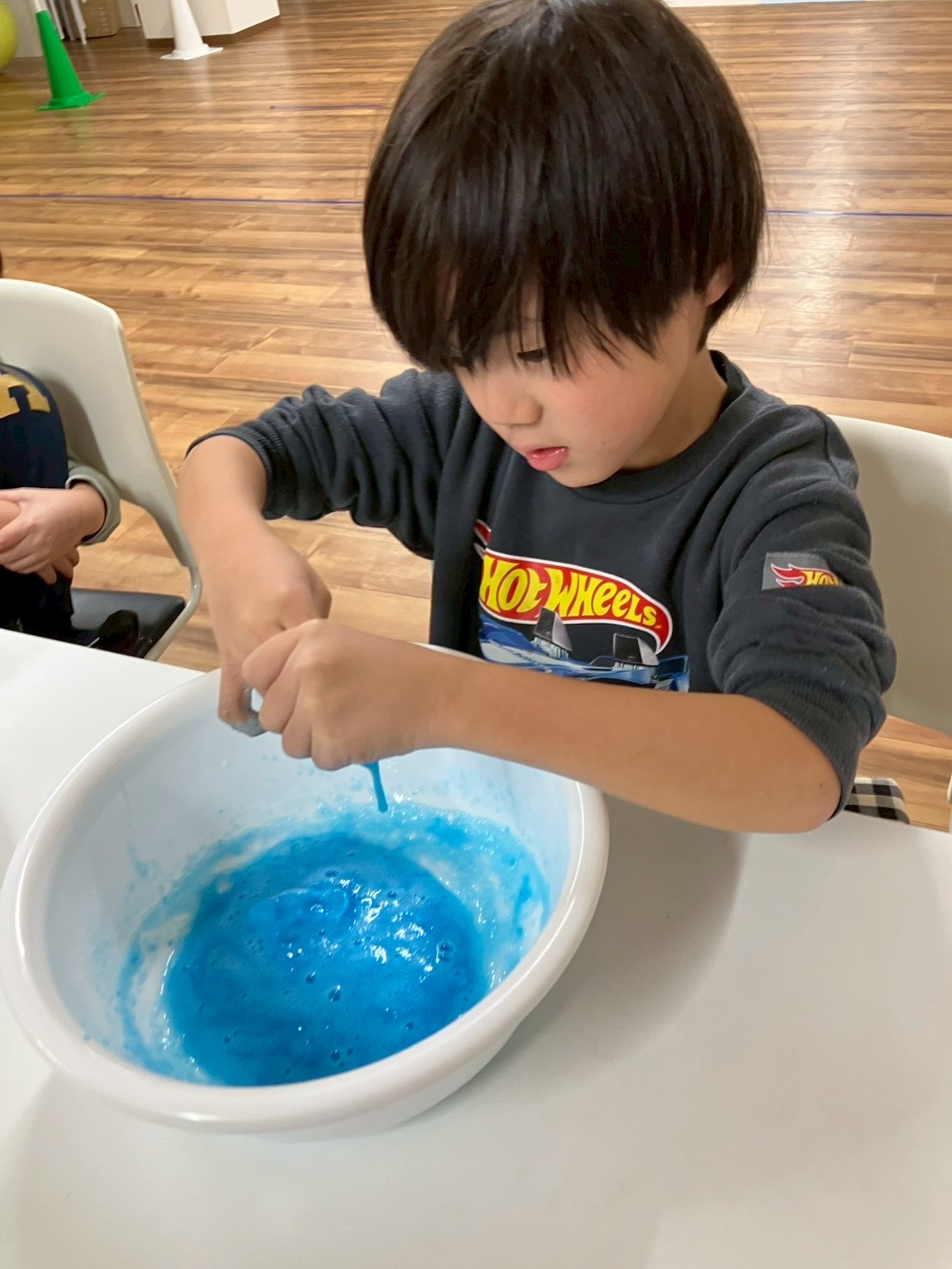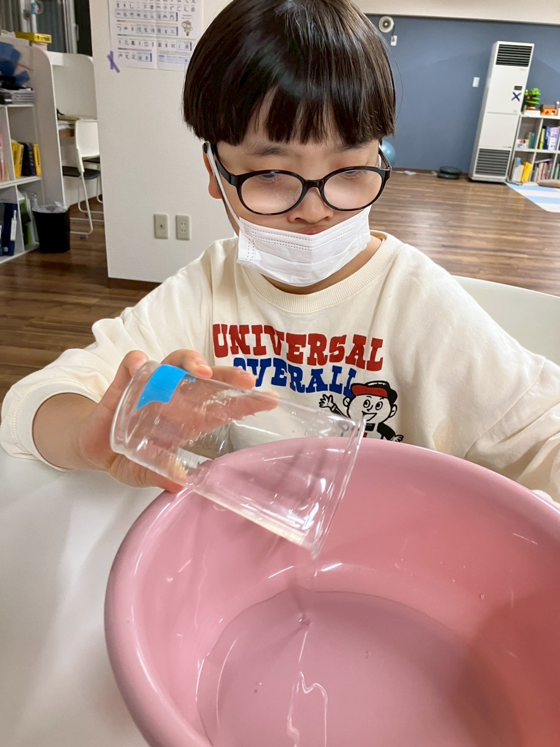 洗濯のり50mlと、水50mlを良くかき混ぜて絵の具で色を付けていきます。