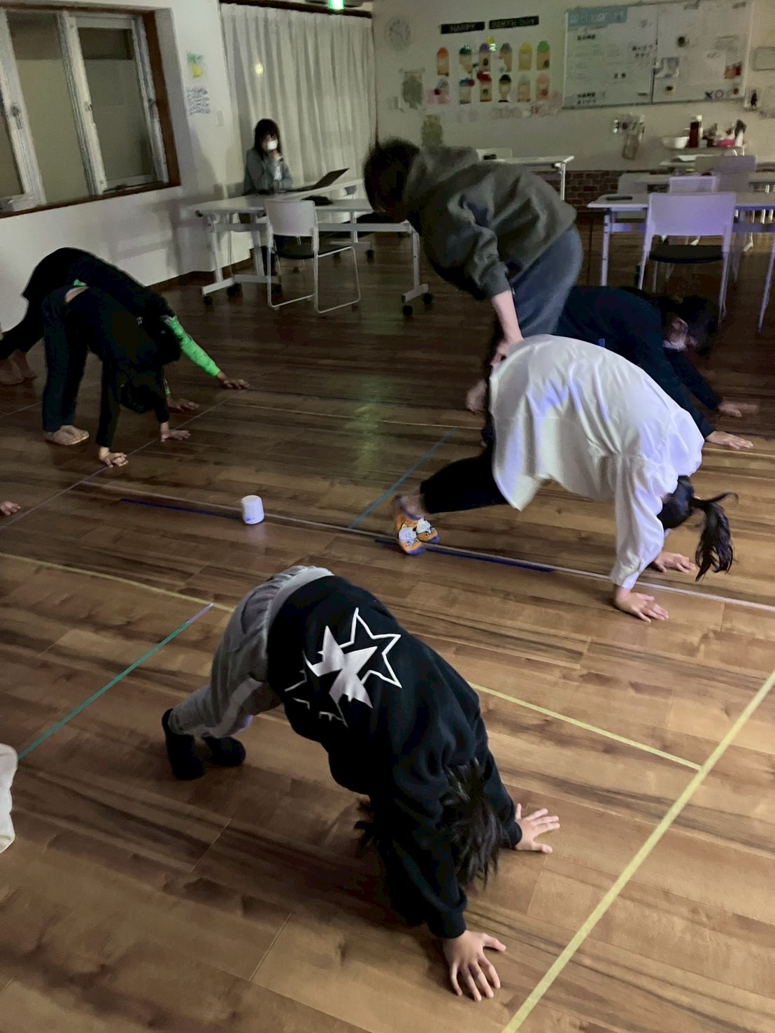 3週目の水曜日は、クモ歩き(ハイハイの逆のような恰好)で腕と腹筋、背中の力を使って動きました!