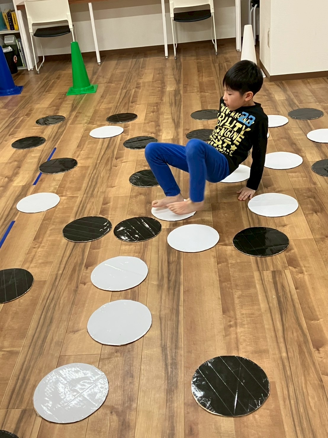 床に巨大オセロが何枚も置き、「白」のオセロにだけ足を乗せて進みました!